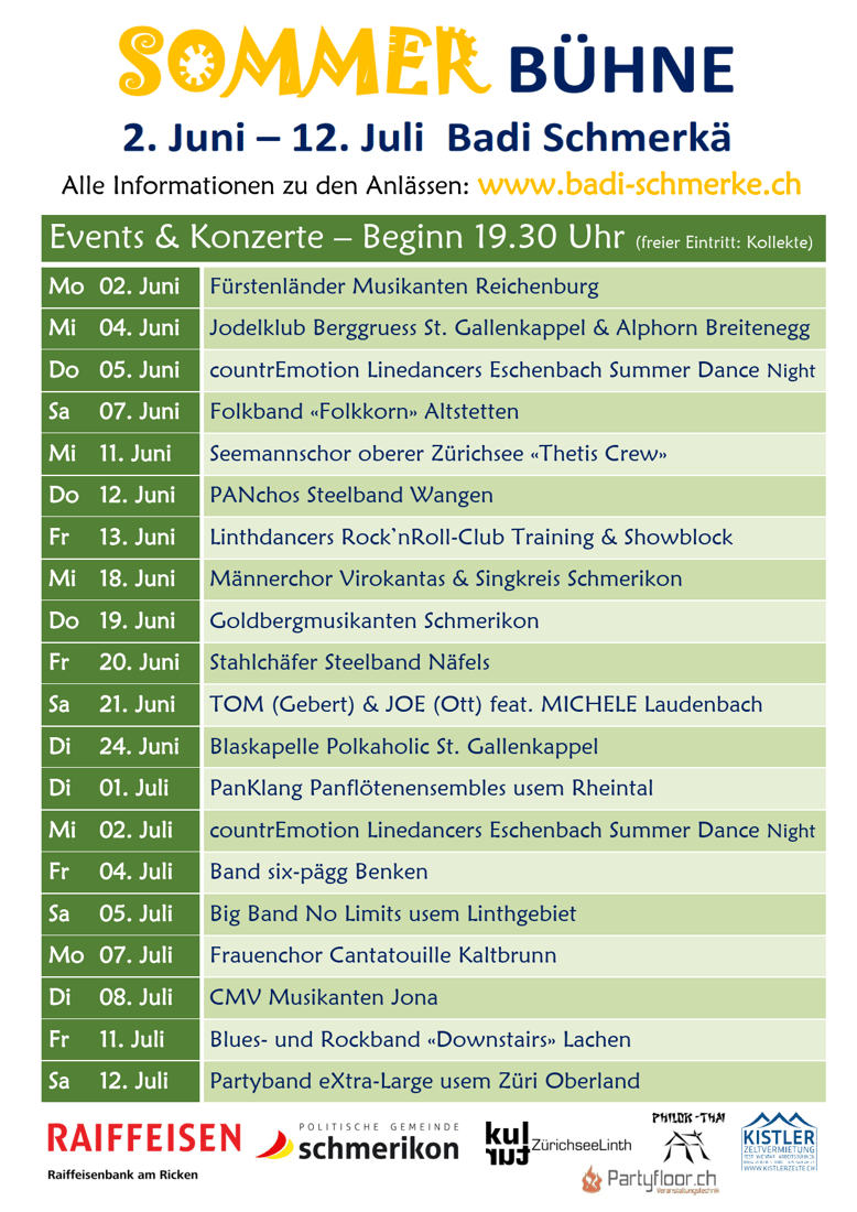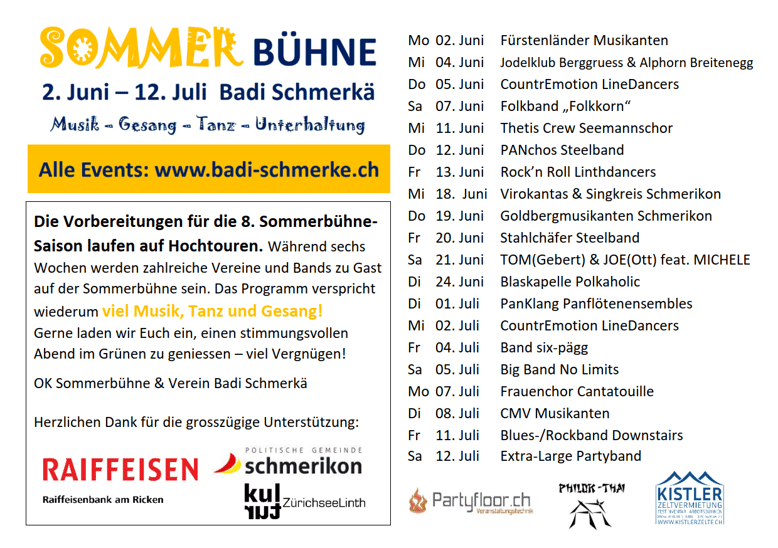 20 Anlässe bunt gemischt haben in den letzten 6 Wochen in der Badi Schmerkä stattgefunden. Wir durften zahlreiche Abende mit stimmungsvoller Musik aller Art, fröhlichem Gesang, Tanz und ausgelassener Stimmung erleben. Einmal mehr wurde die Sommerbühne zum Treffpunkt für kulturelle Anlässe mit vielen schönen Begegnungen, Geselligkeit und guten Gesprächen - nicht nur fürs Dorf, sondern für die ganze Region.