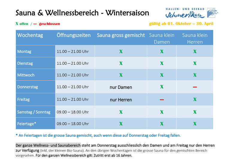 An den Spezialtagen steht der GESAMTE Wellnessbereich ausschliesslich den Damen (donnerstags) oder den Herren (freitags) zur Verfügung. Während der ganzen Sommersaison (01.05-30.09.25) bleiben die kleinen Biosaunen geschlossen.
